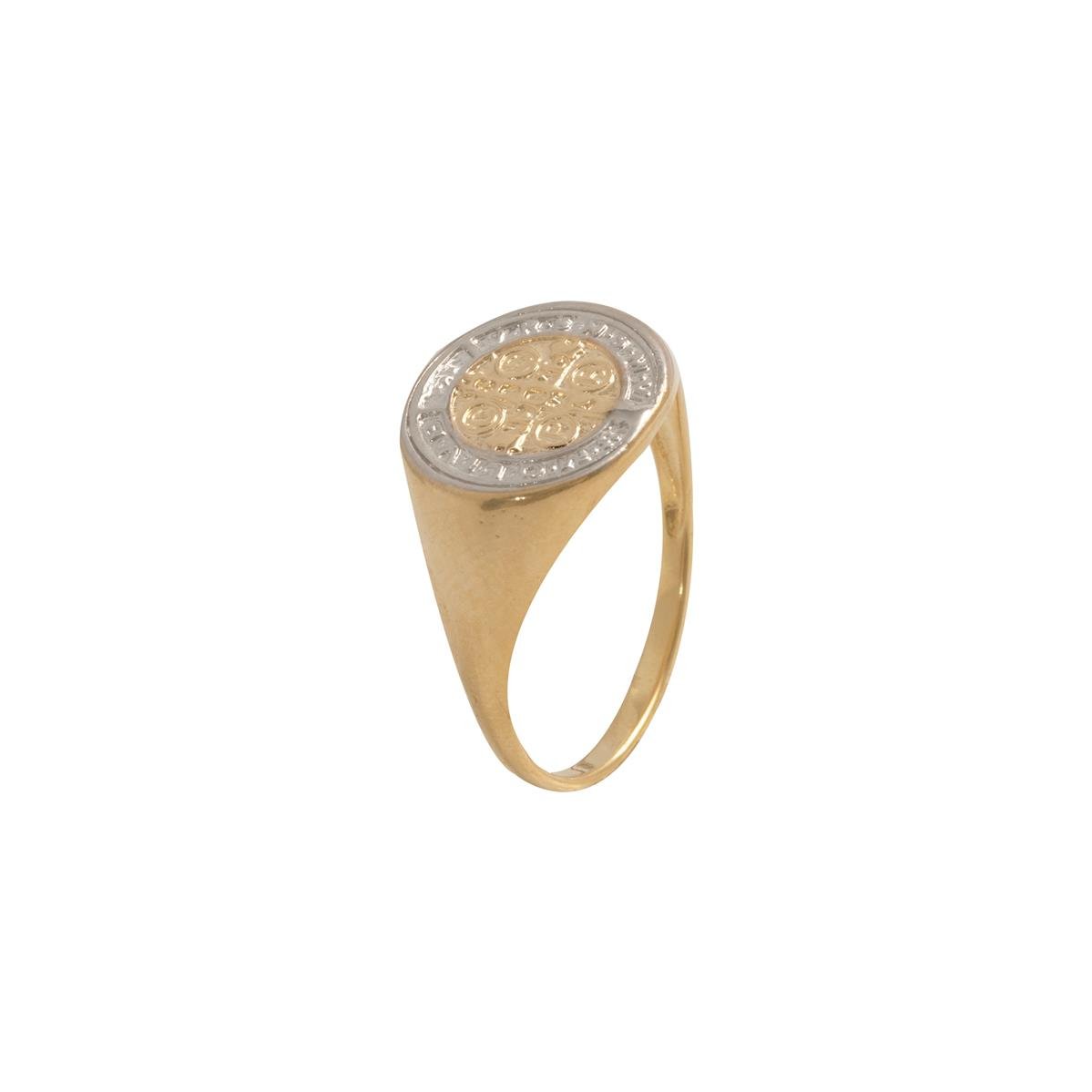 Anel folheado a ouro 18k modelo com aliança lisa e com na parte superior chapa redonda e grande trabalhada com simbolo de São Bento e a borda lisa de ródio