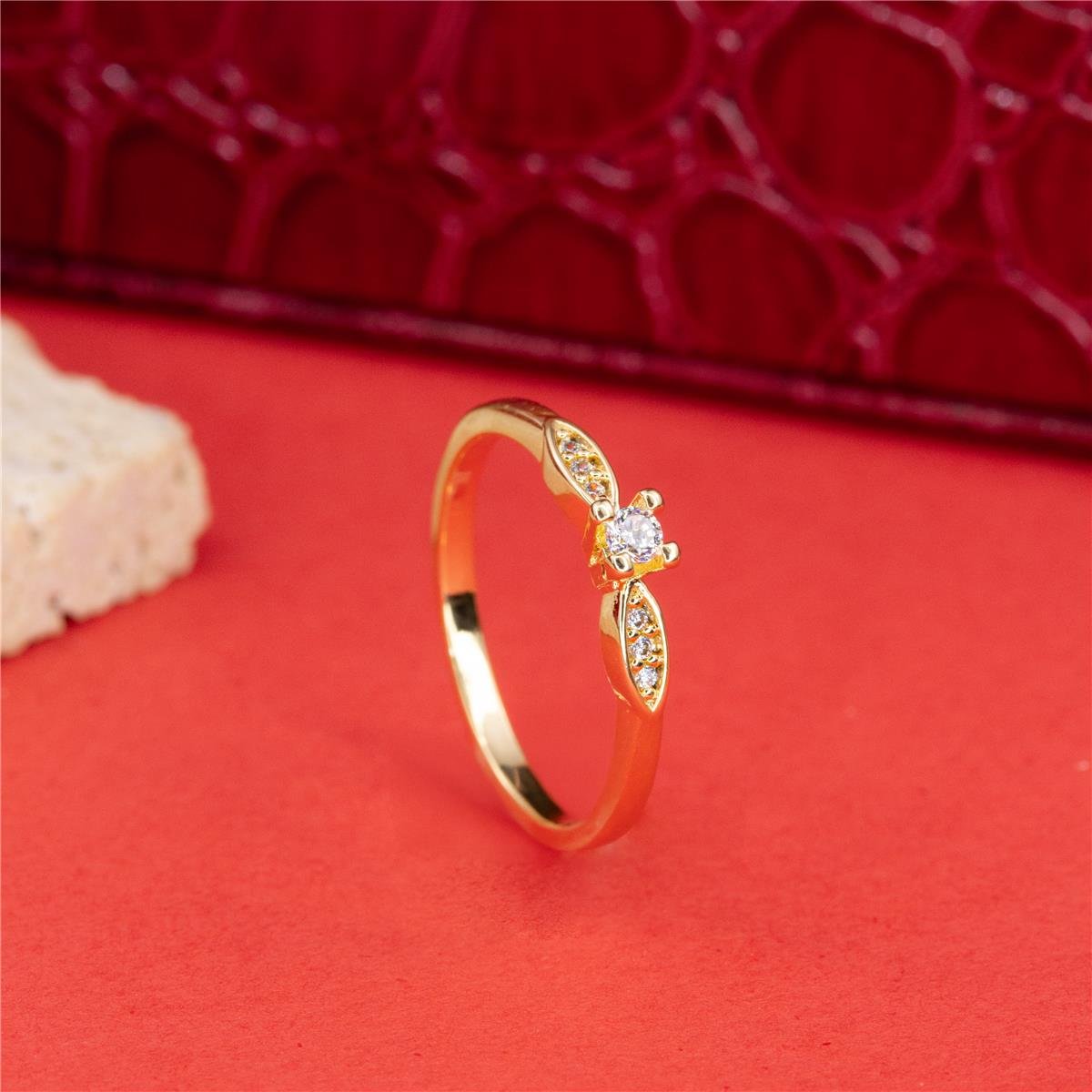 Anel folheado a ouro 18k modelo fino com a parte superior trabalhada com mini zircônias em cada lado e no centro com solitário pequeno Solitário com 0,3mm