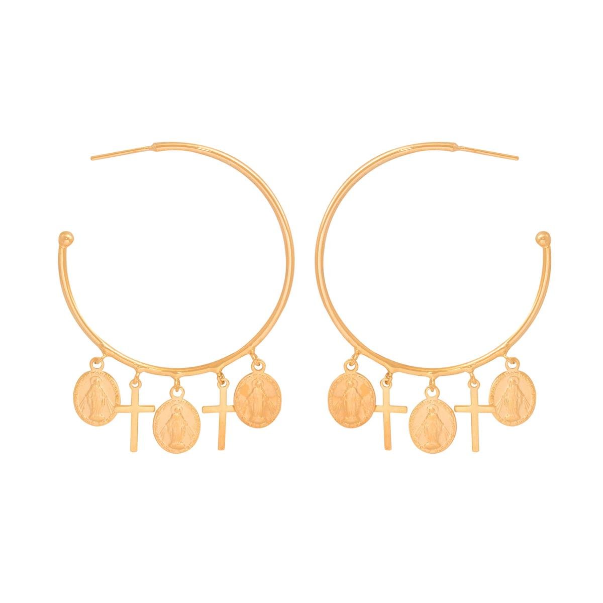 Brinco folheado a ouro 18k modelo argola média e aberta com 3 medalhas ovais pequenas com imagem de Nossa Senhora das Graças e 2 cruzes pequenas lisas todos penduradas
