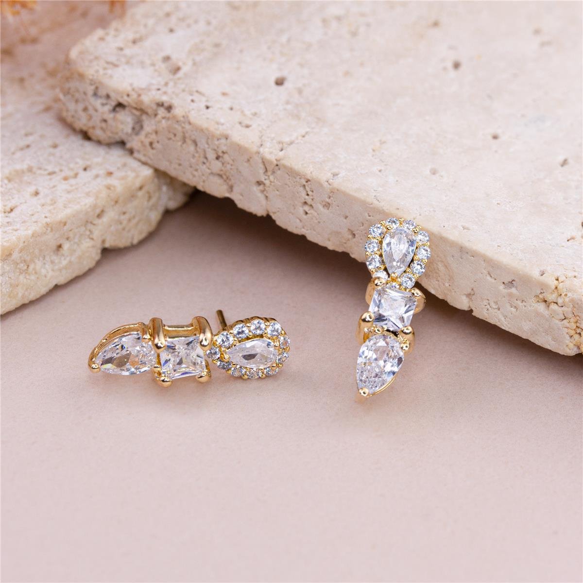 BRINCO FOLHEADO A OURO EAR CUFF COM ZIRCÔNIAS EM GOTA E QUADRADO