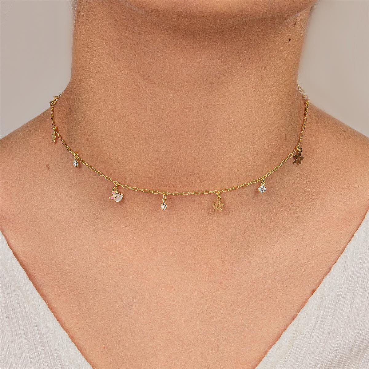 Choker folheado a ouro 18k modelo infantil com fio de corrente de mini elos com mini flores e zircônias penduradas e no centro mini raposinha toda de resinaCordão: 24cm + 9cm de fio extensor