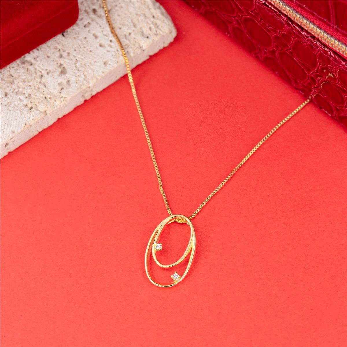 Colar Folheado a ouro 18k modelo de fio veneziano com pingente de dois aros um dentro do outro lisos e finos trabalhados com apenas uma mini zircônia em cadaFio com 45cm sem auxilio do fio extensor