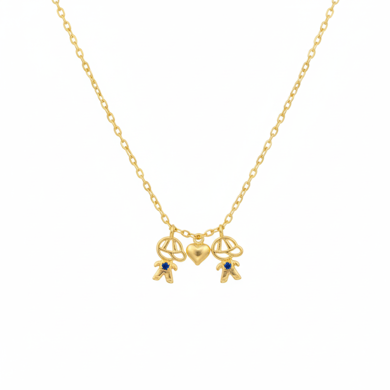 Colar com banho no folheado a ouro 18k com modelo do fio de mini elos com três pingentes sendo eles dois meninos (1,0cm de alt) lisos com a cabeça vazada e no centro mini zircônia azul e entre eles um mini coração liso (0,5mm)Cordão de 45cm com o auxilio do fio extensor de 4cm podendo chegar a 49cm