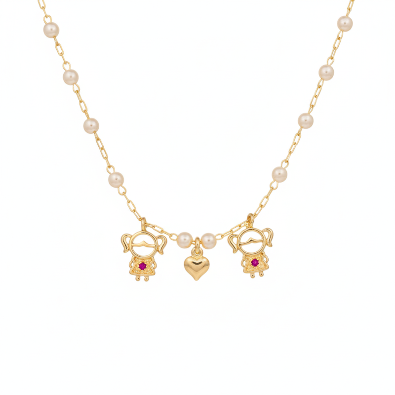 Colar folheado a ouro 18k modelo metade do fio veneziano e metade de mini elos com mini pérolas e com duas meninas sendo lisas e vazadas com no centro de cada uma, uma mini zircônia vermelha e entre elas um mini coração lisoCordão: 45cm + 4cm de fio extensor