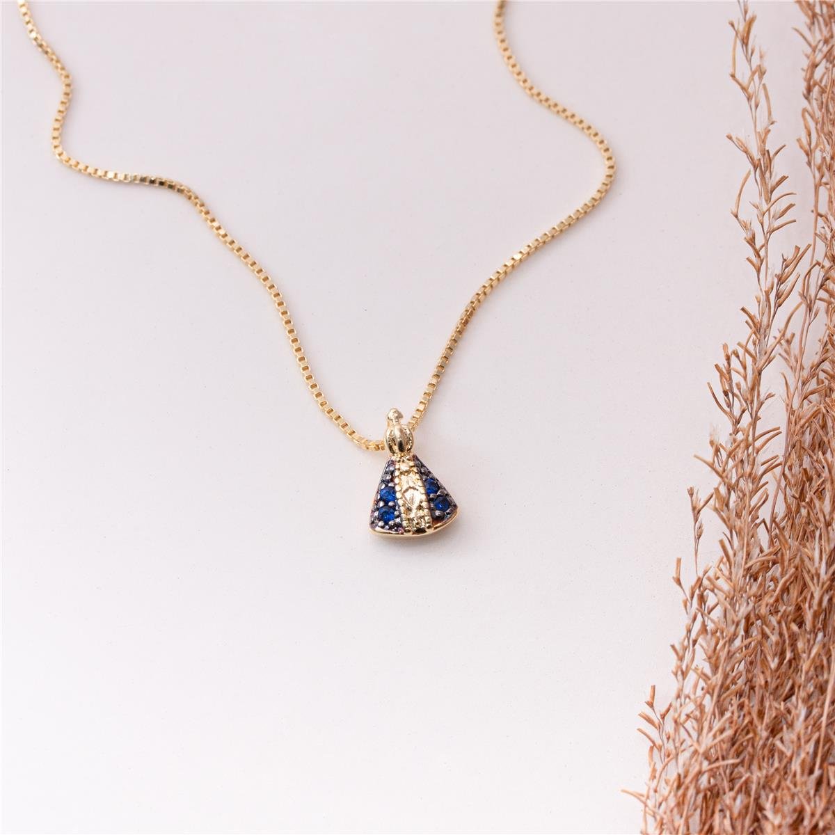 Colar folheado a ouro 18k modelo delicado com imagem de Nossa Senhora Aparecida pequena (1,0cm de alt x 0,8mm de larg) com o centro da imagem lisa e o manto trabalhado de zircônias azuis.Cordão fio veneziano de 45cm com o auxilio do fio extensor de 5cm fazendo cordão chegar até 50cm