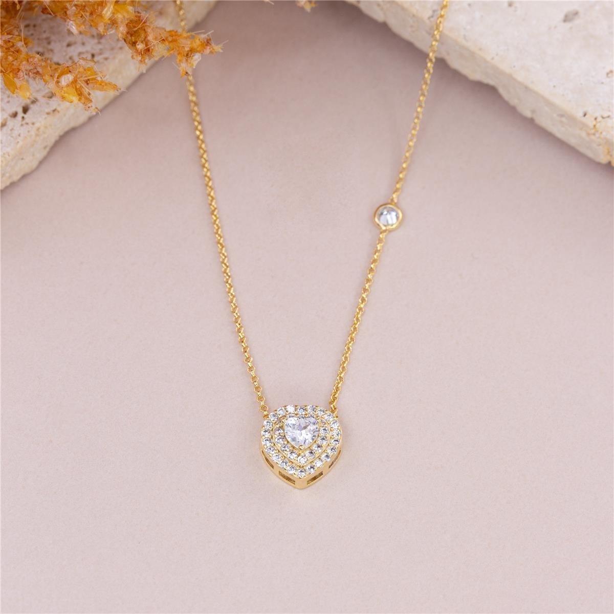 Colar folheado a ouro 18k modelo de fio de mini elo português com no fio duas mini zircônias e no centro zircônia pequena em formato de coração com duas faixas em formato de coração e mini zircôniasCordão com 45cm e o auxilio do fio extensor de 5cm podendo chegar até 50cm