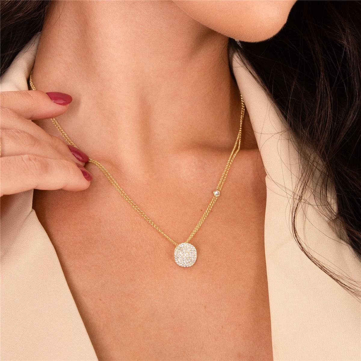Colar folheado a ouro 18k modelo com de dois fios de mini elo português com em apenas um dos fios uma mini zircônia e no centro pingente de forma redonda e ondulada toda de mini zircônias cristaisCordão com 40cm e o fio extendor de 5cm fazendo chegar até 45cm de comprimento