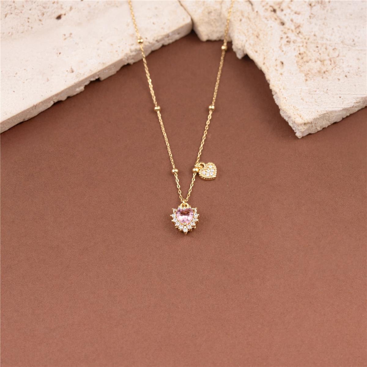Colar folheado a ouro 18k modelo com fio de mini elos trabalhado todo de mini bolas lisas com dois corações penduradas com mini coração de mini zircônias e coração pequeno de zircônia e a borda toda de mini zircôniasCordão com40cm e o fio extensor de 5cm podendo chegar a 45cm