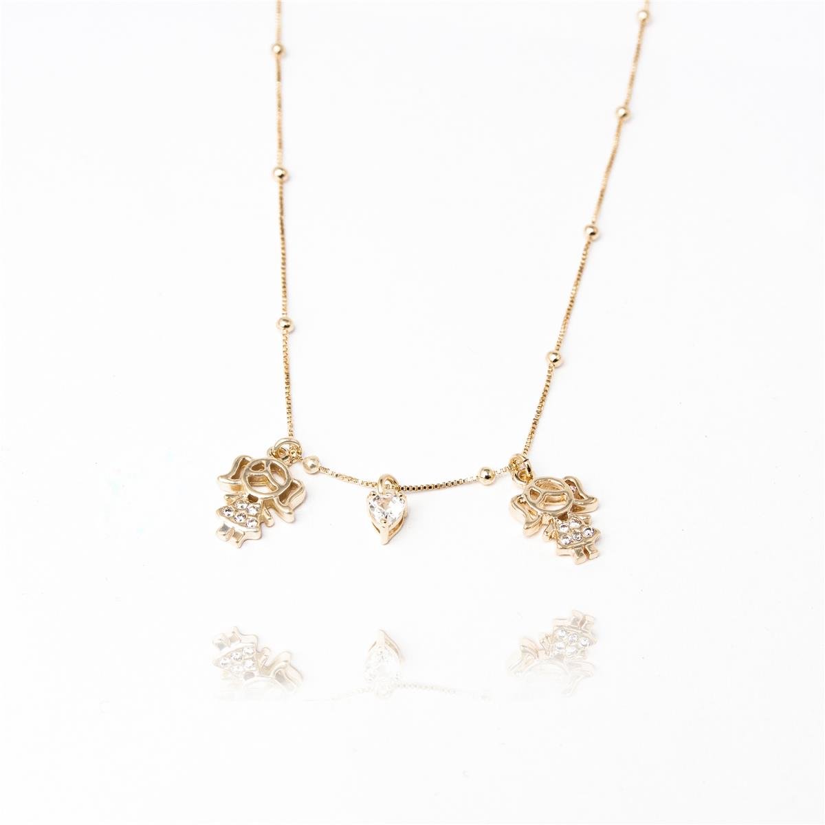 Colar folheado a ouro 18k modelo fio com bolinhas lisas com pedra em formato de coração pequeno e duas meninas com corpo liso e cabeça vazada com vestido todo de zircônia penduradosCordão: 44cm + 4cm de fio extensor