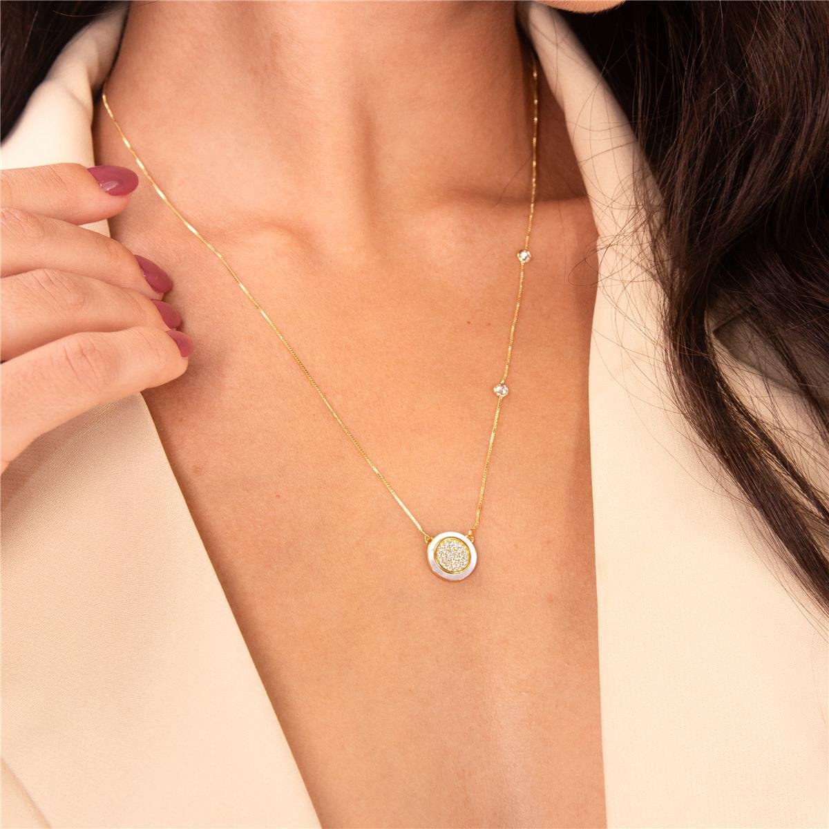 Coalr com banho no folheado a ouro 18k modelo com fio veneziano trabalhado com 2 mini zircônias pelo fio e no centro forma redonda (1,2cm de alt e larg) trababalhada com a borda de madrepérola e no centro circulos de mini zircônias cristaisCordão com 50cm e fio extensor de 5cm podendo chegar até 55cm