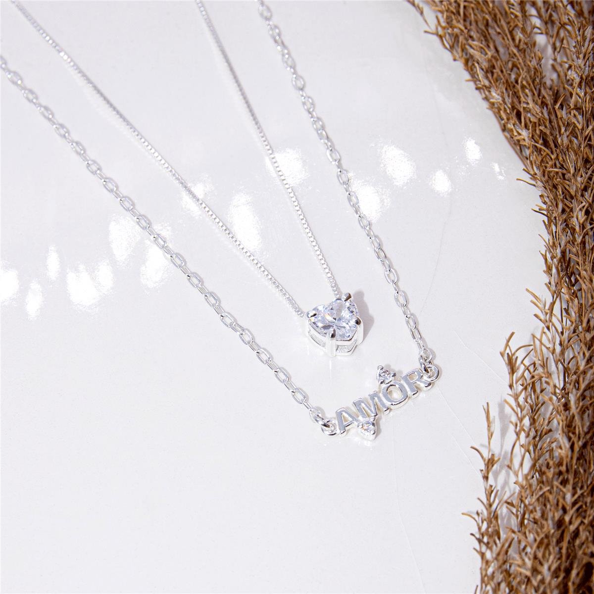 Colar prata modelo 2 fios com o fio menor veneziano com pingente de pedra em formato de coração e o fio maior de mini elos com palavra Amor Lisa com 2 mini zircônias em voltaFio menor: 40cm + 6cm de fio extensor