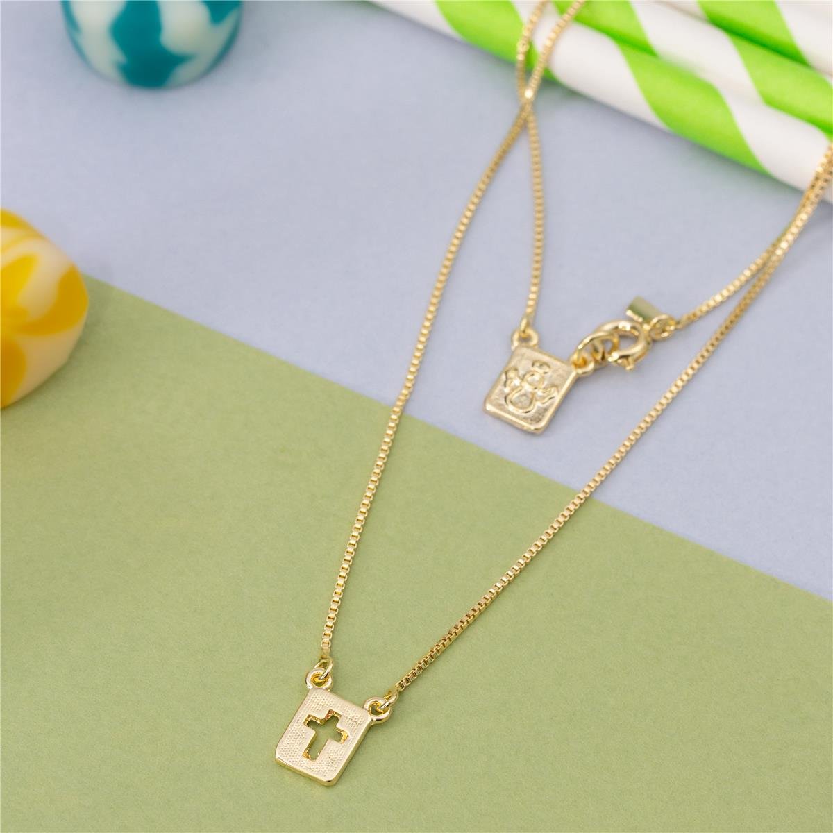 Escapulário folheado a ouro 18k modelo infantil com fio veneziano com duas placas retangulares pequenas com em uma trabalhada com mini cruz vazada e na outra placa um mini anjo e com fecho estilo molaCordão: 35cm