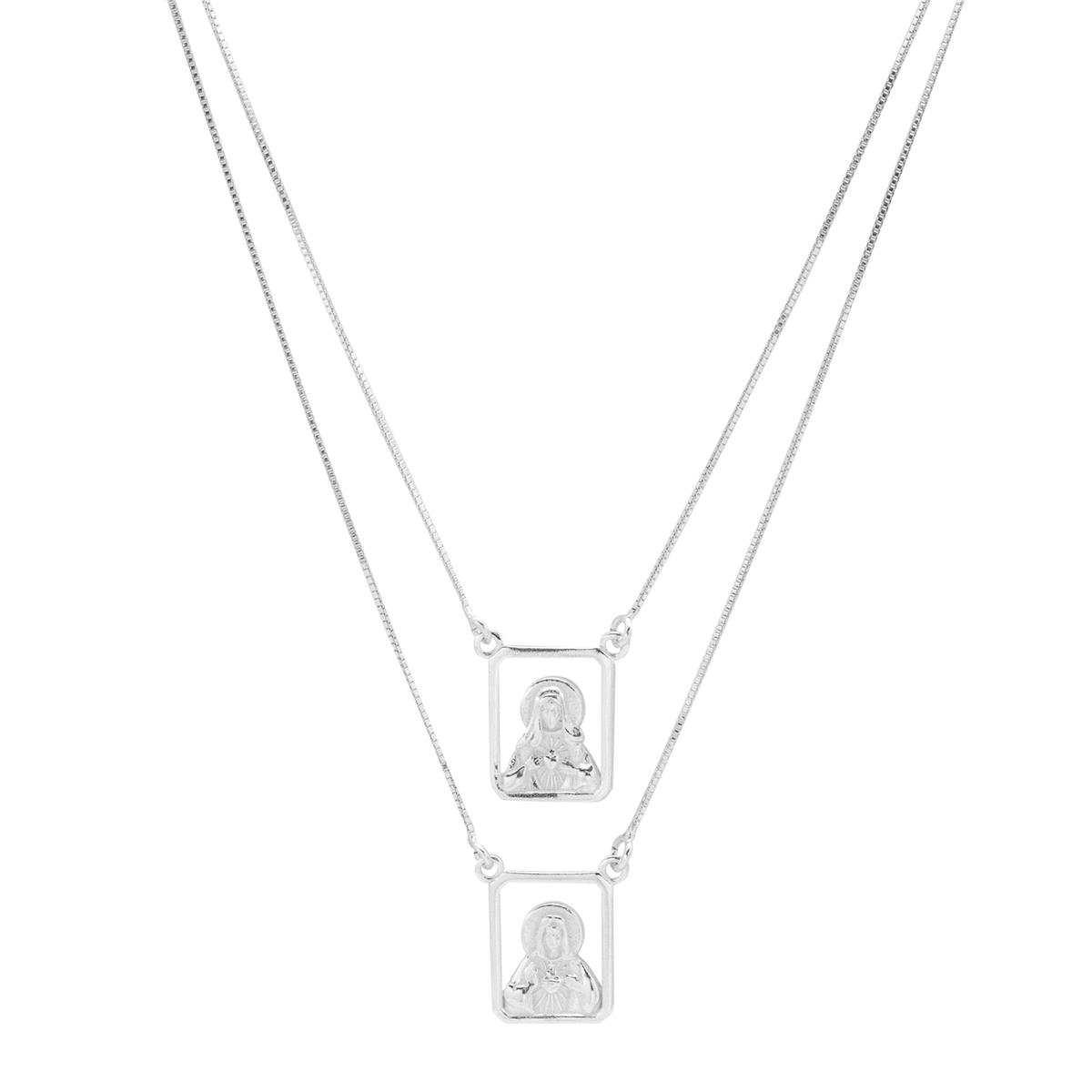 Escapulário prata modelo fio veneziano com duas placas quadradas médias vazadas com imagem de Sagrado Coração de Jesus e Sagrado Coração de Maria trabalhado lisos