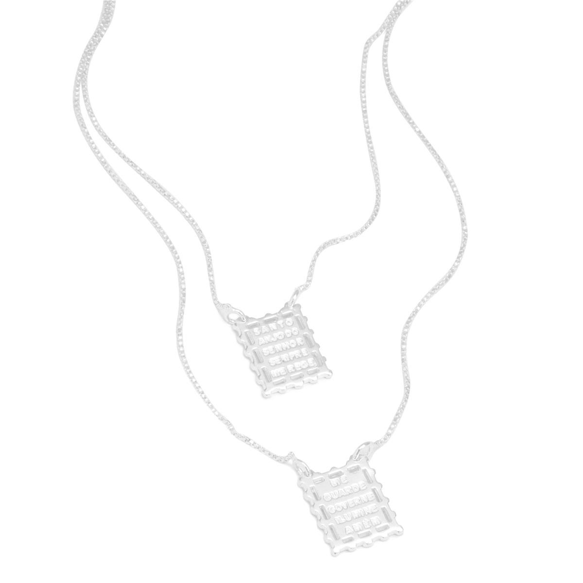 Escapulário prata modelo fio veneziano com duas placas quadradas com a borda trabalhadas e com vazados e no centro com "Santo anjo do senhorsempre me rege" e "Me guarde goverene ilumine amém"
