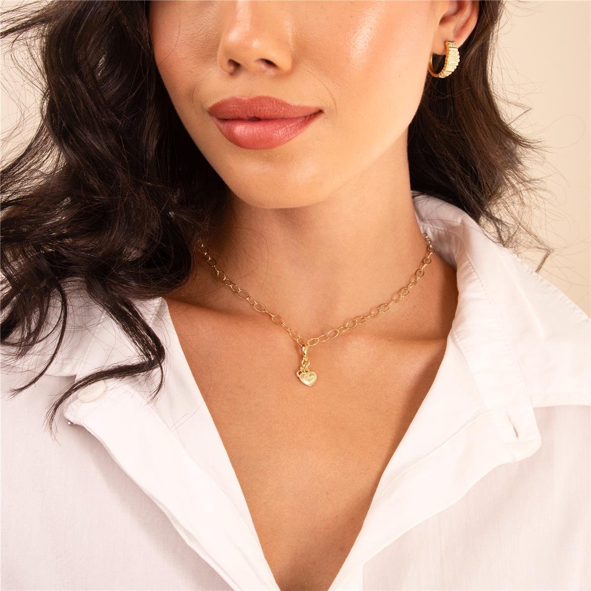 Pingente com banho no folheaodo a ouro 18k modelo com argola lisa (0,8cm de alt) e com fecho de clique para encaixar em qualquer fio e com pendurado coração pequeno e liso com a borda trabalhada com mini pontinhos e no centro palavra "Amor" e também com pendurado mini zircônia com a borda lisa: