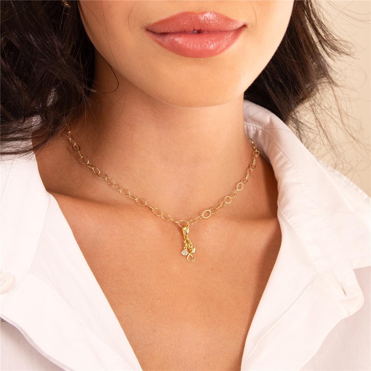 Pingente com banho no folheaodo a ouro 18k modelo com argola lisa (0,8cm de alt) e com fecho de clique para encaixar em qualquer fio e com pendurados um mini coração liso (0,4mm), uma mini zircônia com a borda lisa (0,3mm) e um infinito liso peqaueno (1,0)