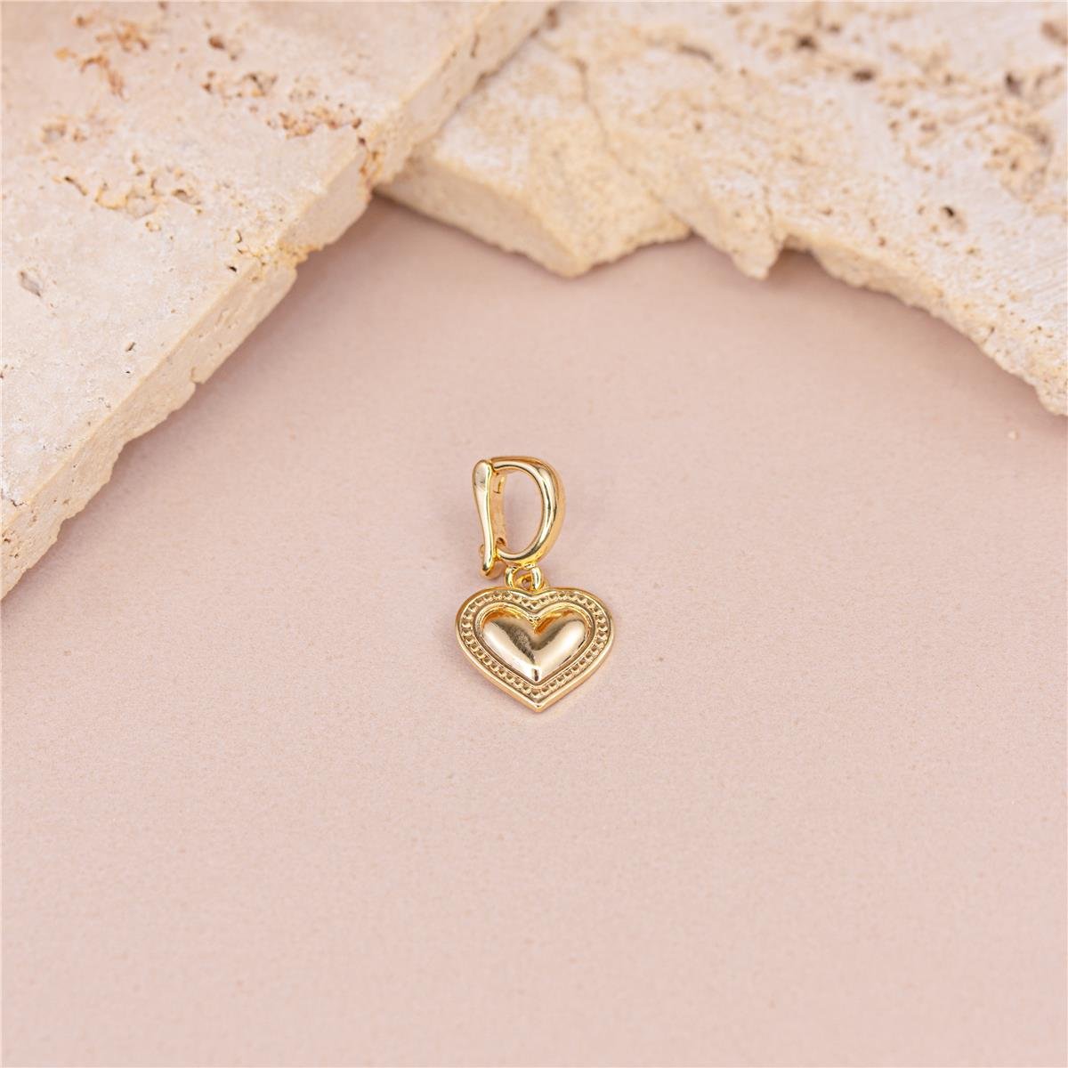 Pingente com banho no folheado a ouro 18k modelo com argola lisa (0,8cm de alt) e com fecho de clique para encaixar em qualquer fio e com pendurado coração médio todo liso com a borda trabalhada de mini pontinhos (1,0cm de largura e altura)