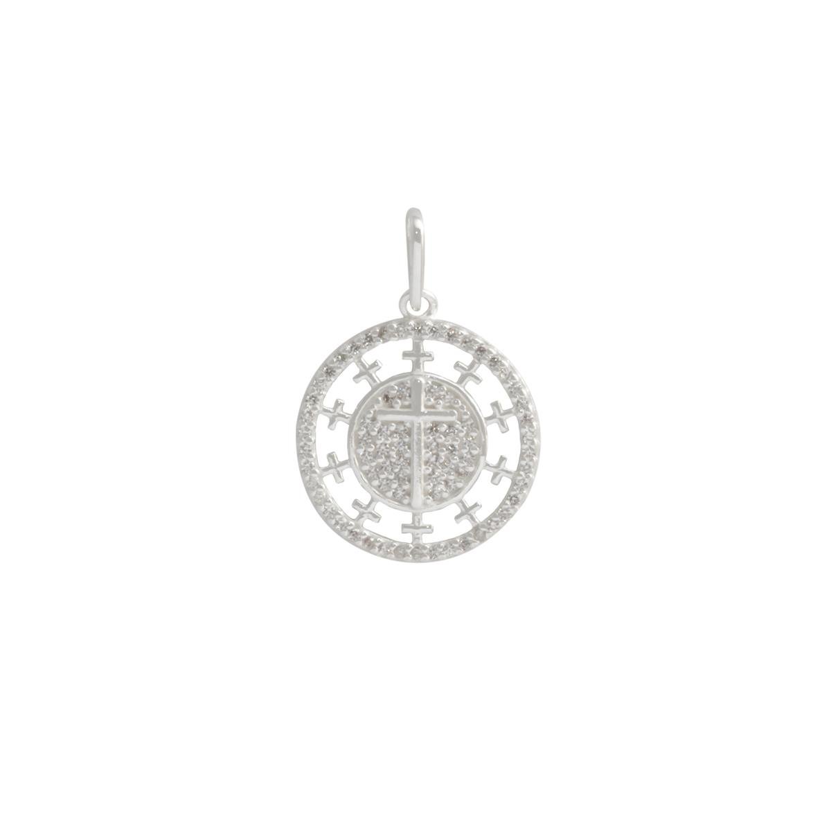 Pingente prata modelo medalha redonda média vazada e borda de mini zircônias com no centro medalha menor de zircônias e cruz pequena lisa e pela borda mini cruzes lisas