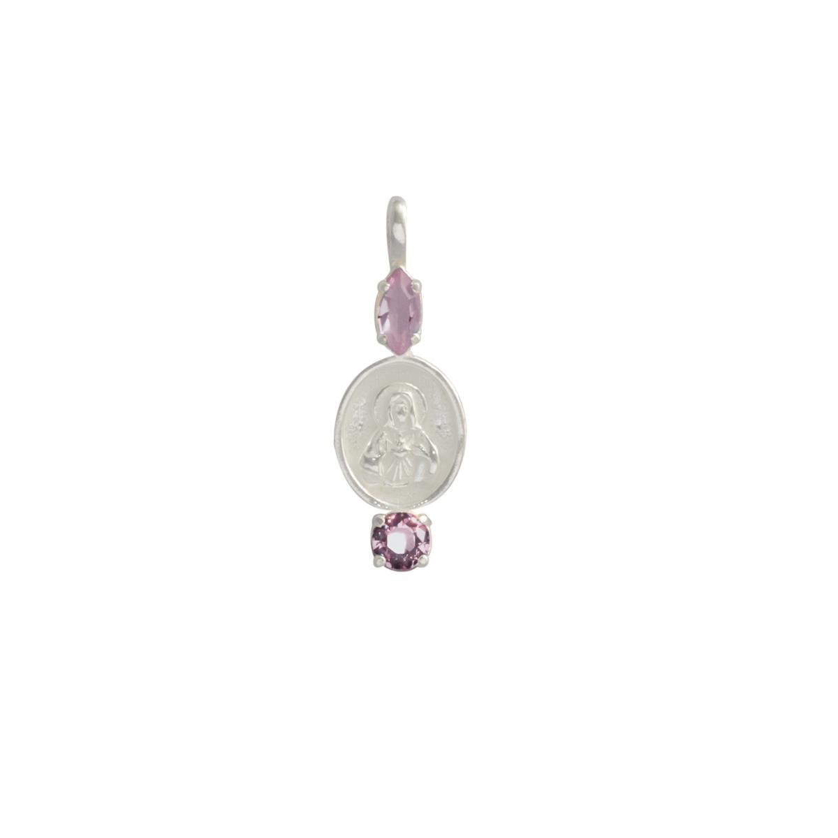 Pingente prata modelo modelo com duas pedras pequenas em formato de navete e redonda e entre elas medalha pequena e lisa com imagem de Sagrado Coração de Jesus