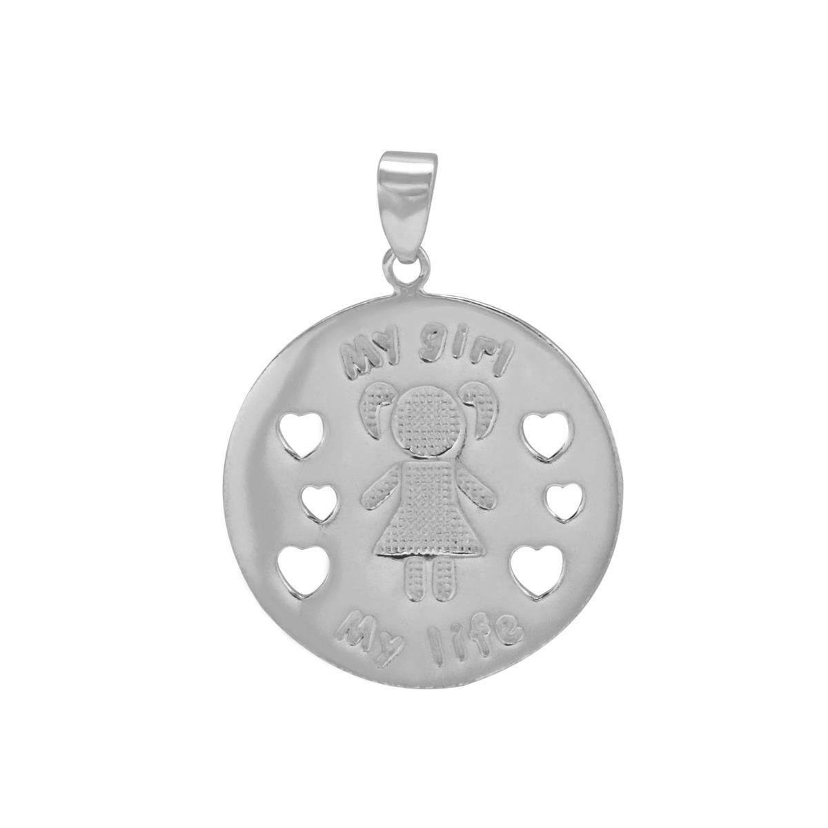 Pingente prata modelo medalha redonda grande lisa trabalhada com 6 corações pequenos e vazados no centro com imagem de menina liso com frase na parte superior "My Girl" e na inferior "My Life"
