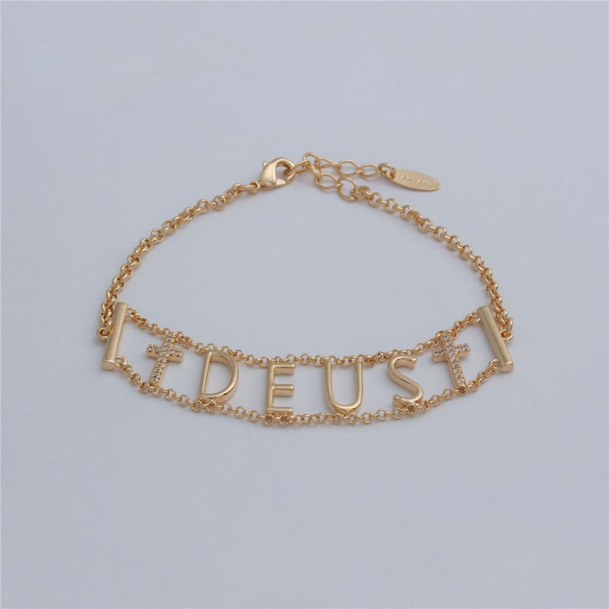 Pulseira folheado a ouro 18k modelo fio de corrente com placa com palavra Deus lisa e com uma cruz em cada lado de zircôniasPulseira: 17cm + 3cm de fio extensor
