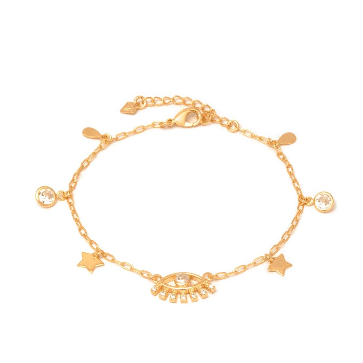 Pulseira folheado a ouro 18k modelo fio de corrente cartier de elos pequenos com olho liso e vazado trabalhado com zircônias e com mini gotas e estrelas lisas pendurados e zircônias pequenas redondas penduradosPulseira: 16cm + 4cm de fio extensor