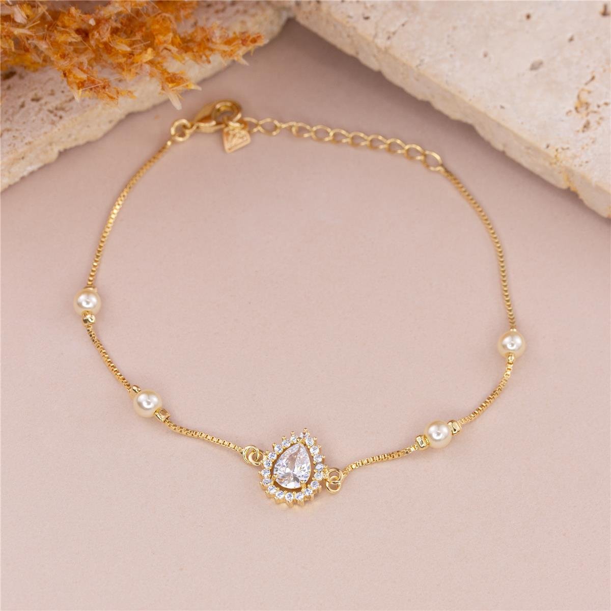 Pulseira folheado a ouro 18k modelo com fio veneziano trabalhado com 4 mini pérolas e no centroda pulseira zorcônia em forma de gota com a borda toda de mini zircôniasPulseira com 18cm e o auxilio do fio extensor de 4cm podendo chegar a 22cm