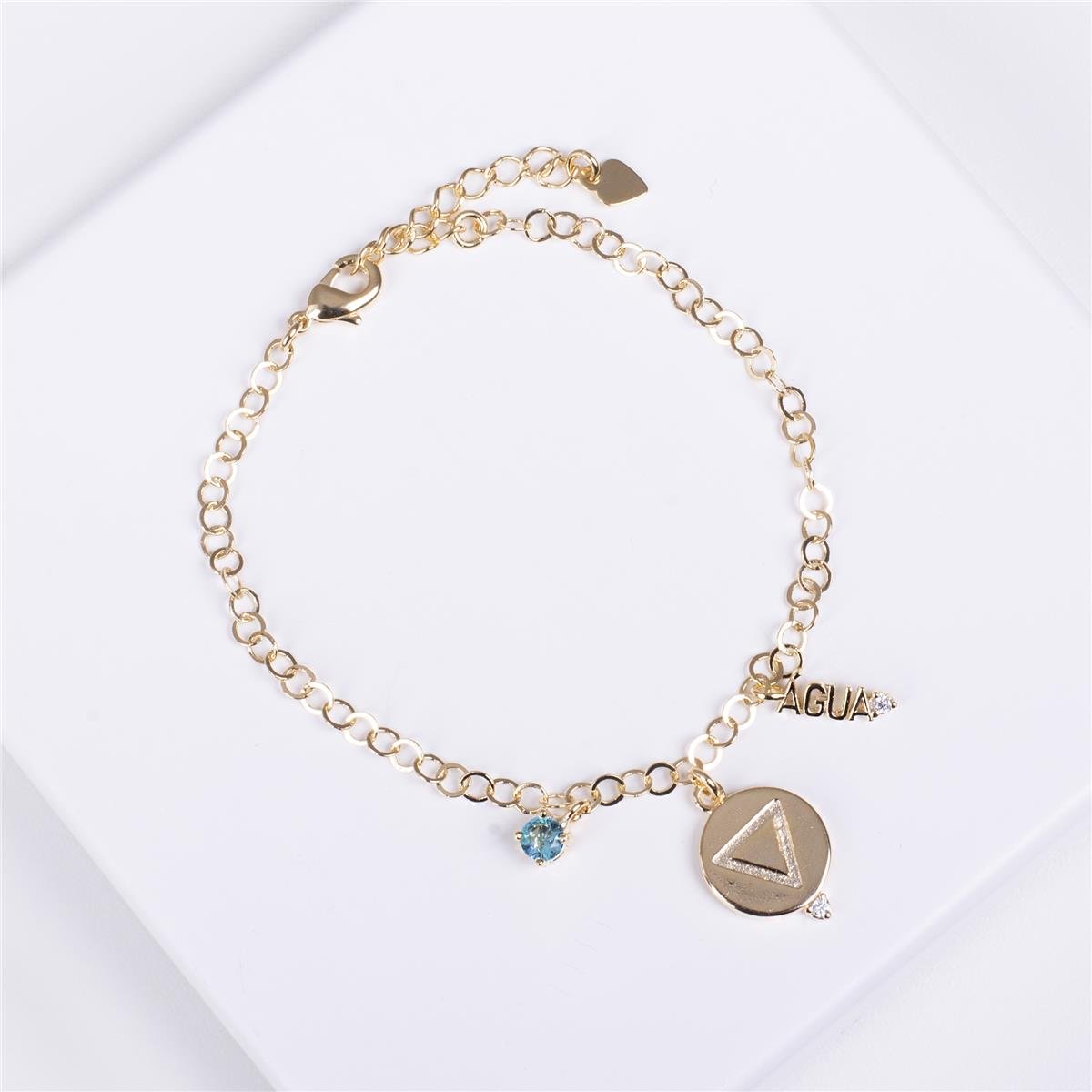 Pulseira folheado a ouro 18k modelo fio de elos com medalha redonda pequena com simbolo e palavra do elemento Água, palavra Água lisa pendurada com 1 mini zircônia na ponta e com zircônia redonda todos penduradasPulseira: 16cm + 4cm de fio extensor