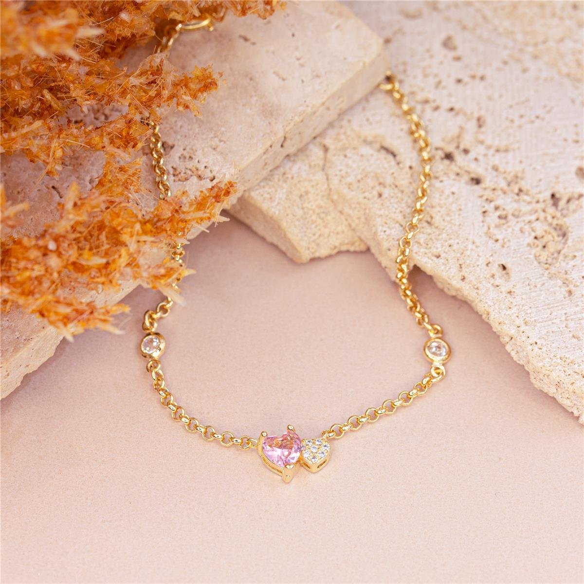 Pulseira folheado a ouro 18k modelo modelo com fio de elo português pequeno com trabalhado duas mini zircônias entre os elos e no centro dois corações sendo um pequeno todo de mini zircônias e um pequeno de zircônia em formato de coração e a borda toda de mini zircôniasPulseira com 18cm e o auxilio do fio extensor de 4cm podendo chegar a 22cm